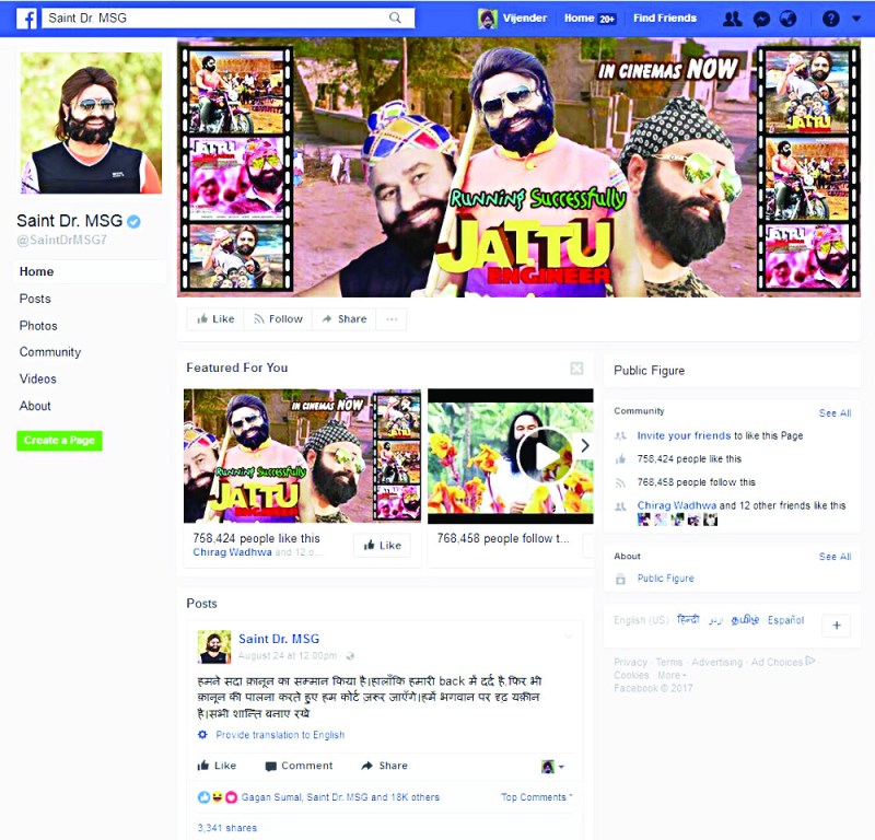 डेरा मुखी व हनीप्रीत के नाम से बने फेसबुक पेजों को लाइक्स करने वालों की संख्या बढ़ रही है। सेंट डॉ. एमएसजी के फेसबुक पेज पर शनिवार सुबह 11 बजे तक 7 लाख, 58 हजार 280 लाइक्स थे, जिनकी संख्या शाम साठ बजे बढ़कर 7 लाख, 58 हजार 420 हो गई। इसी तरह, हनीप्रीत इंसा के नाम से बने फेसबुक पेज के शनिवार सुबह 5 लाख 24 हजार 504 लाइक्स थे जो शाम साढे आठ बजे 5 लाख 25 हजार 060 हो गए।