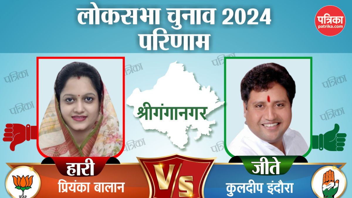 राजस्थान की श्रीगंगानगर लोकसभा सीट ऐतिहासिक रूप से अहम सीट है। यहां 1952 से अब तक 11 बार कांग्रेस ने जीत हासिल कर ली है। इस सीट पर भाजपा और कांग्रेस के बीच तगड़ा मुकाबला है। भाजपा प्रत्याशी प्रियंका बैलान और कांग्रेस के कुलदीप इंदौरा के बीच किसकी जीत इसे लेकर कई तरह के कयास लगाए जा रहे थे। श्रीगंगानगर में कुल 2102002 मतदाता हैं, यहां 8 सीटों में श्रीगंगानगर जिले की सादुलशहर, गंगानगर, करनपुर, सूरतगढ़ और रायसिंह नगर विधानसभा और हनुमानगढ़ जिले की सांगरिया, हनुमानगढ़ और पिलीबंगा विधानसभा सीट शामिल हैं। इस संसदीय क्षेत्र में मतदान 19 अप्रैल को हुआ था, जिसमें कुल 66.59 प्रतिशत वोट पड़े।