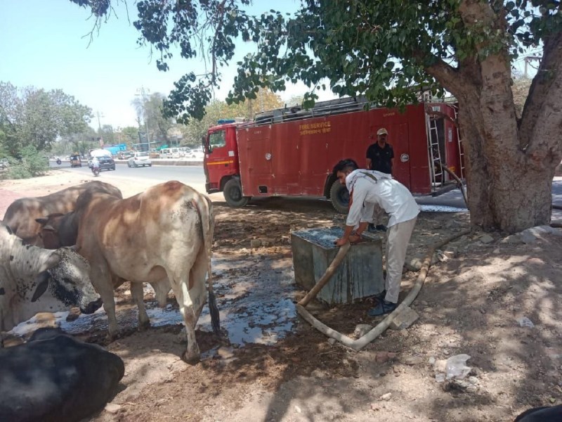 श्रीगंगानगर। इलाके में प्रचंड गर्मी और लू के प्रकोप में बेजुबान पशुओं के लिए नगर परिषद की दमकल की गाड़ी सहारा बनकर सामने आई है। अब तक फायर बिग्रेड का काम सिर्फ आग बुझाना था लेकिन प्यास से व्याकुल हो चुके बेजुबान गौवंश के लिए दमकल कार्मिकों ने मानवता का परिचय दिया। नगर परिषद के अग्निशमन सेवा केन्द्र की फायर बिग्रेड की दो गाडि़यों को अलग अलग रूट पर भेजा गया। आयुक्त यशपाल आहुजा ने बताया कि सूरतगढ़ बाइपास पर तूड़ी की टाल के पास काफी संख्या में बेसहारा पशुओं के प्यासे होने की सूचना आई थी जैसे ही दमकल कार्मिक ने फायर बिग्रेड की गाड़ी से पानी वहां एक खेळी में डालना शुरू किया तो वहां पशुओं में पानी पीने का तांता लग गया। इसी प्रकार सूरतगढ़ रोड पर नाईवाला सरकारी स्कूल के पास खाली जगह में सीमेंट की टंकी में पानी डालने के लिए दमकल कार्मिक ने प्रक्रिया शुरू की तो पशुओं ने उसे घेर लिया। इसी प्रकार मीरा चौक के पास नायक धर्मशाला के आगे बैठे पशुओं के लिए पानी डलवाया गया। वहीं करणपुर रोड पर जेसीटी मिल के सामने पशुओं के झुंड के लिए पानी का बंदोस्त कराया।