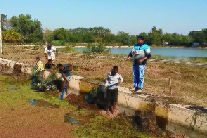इससे कचरे को किनारे तक लाया जा रहा है जहां तीन से चार कर्मचारी इसे निकाल रहे हैं। राजस्थान पत्रिका ने मंगलवार के अंक में ‘पेयजल डिग्गियों में पानी पर दो इंच कचरे की परत’ शीर्षक से समाचार प्रकाशित कर विभाग का ध्यान इस तरफ दिलाया था। इसके बाद हरकत में आए अधिकारियों ने सफाई का काम शुरू करा दिया। डिग्गियों में जमा कचरा अजोला घास है।