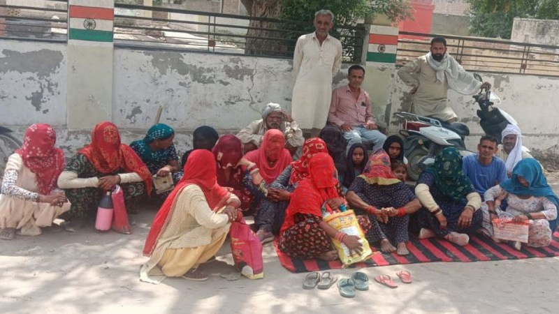 श्रीगंगानगर जिले के गांव लाधूवाला में वाटरवक्र्स आगे धरने पर बैठे ग्रामीण।
