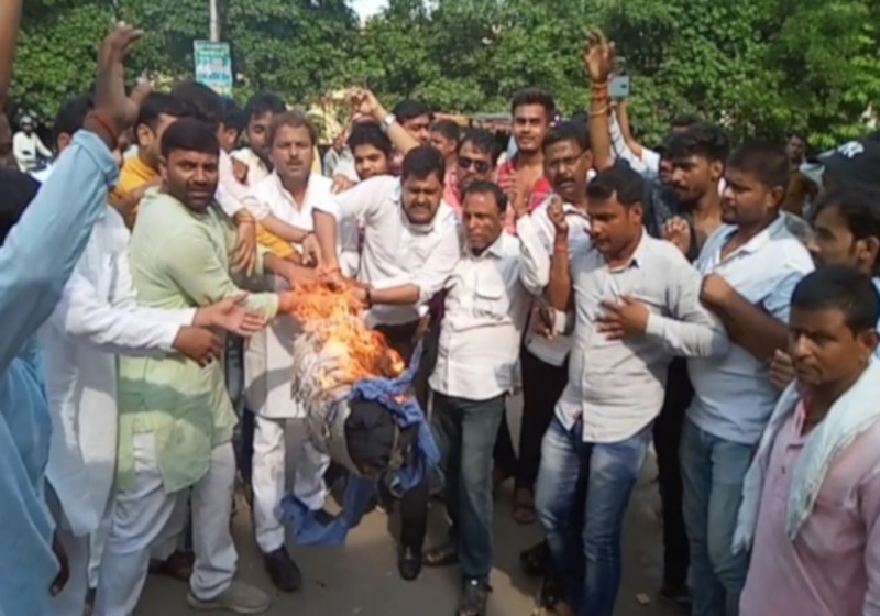 सुल्तानपुर. कांग्रेस पार्टी की राष्ट्रीय महासचिव प्रियंका गांधी को सोनभद्र जाने से रोकने और हिरासत में लिए जाने से नाराज कांग्रेसियों ने कलेक्ट्रेट गेट के सामने मुख्यमंत्री का पुतला फूंक कर प्रदर्शन किया। सोनभद्र के उमभा गांव में जमीनी विवाद को लेकर हुए 11 लोगों की मौत के बाद पीड़ितों से मिलने जा रहीं प्रियंका गांधी को शुक्रवार की दोपहर मिर्जापुर जिला प्रशासन ने हिरासत में ले लिया। इससे पूर्व वाराणसी ट्रामा सेंटर से प्रियंका का काफिला जैसे ही मिर्जापुर के रास्ते सोनभद्र रवाना हुआ वैसे ही नारायणपुर के पास उनको रोक दिया गया। इसी मामले से आक्रोशित कांग्रेसियों ने कलेक्ट्रेट के सामने मुख्यमंत्री का पुतला फूंक कर प्रदर्शन किया।