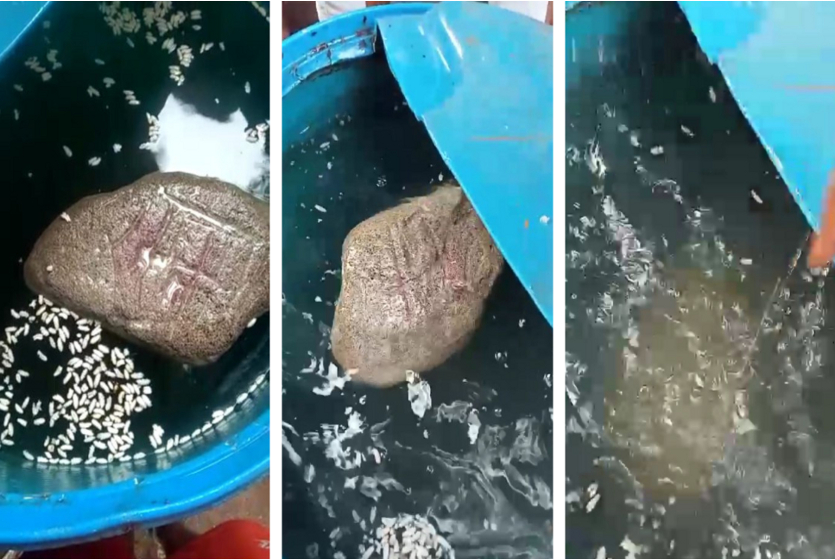 इसी बीच छत्तर घाट के पास पानी में एक पत्थर तैरता हुआ चट्टानघाट की ओर आते देखा। यह देख ग्रामीण ने पत्थर को पकडक़र पानी से बाहर निकाला। मनी लाल का कहना है कि जब उसने पत्थर को देखा तो उसमें एक तरफ राम लिखा हुआ था। वह करीब 3-4 किलो वजनी पत्थर को अपने साथ लेकर श्रीकृष्ण जन्माष्टमी के पूजा स्थल पर आया।