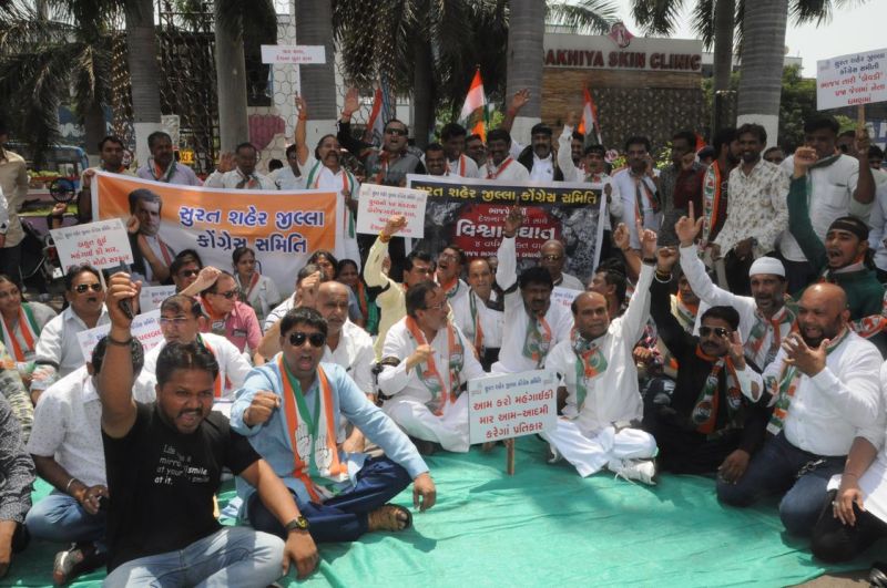 सूरत रेलवे स्टेशन के पास सरदार पटेल की प्रतिमा के पास शनिवार सुबह सूरत शहर कांग्रेस समिति की ओर से धरना दिया गया। इसमें सूरत मनपा के नेता विपक्ष प्रफुल्ल तोगडिय़ा, कांग्रेस नेता प्रभुदास पटेल, भूपेन्द्र सोलंकी, पार्षद इकलाब बेलिम समेत बड़ी संख्या में कार्यकर्ता शामिल हुए। सभी ने काली पट्टी बांध कर रामधुन गाते हुए विरोध जताया।