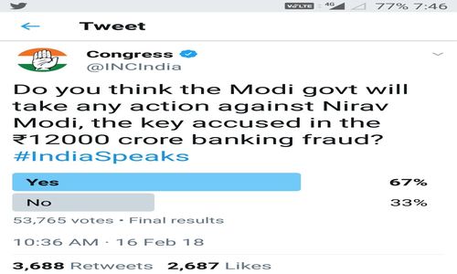 सूरत. पीएनबी घोटाले में नीरव मोदी का नाम सामने आने के बाद केंद्र सरकार बुरी तरह घिरी हुई है। इसी बीच कांग्रेस ने अपने अफीशियल ट्विटर अकाउंट पर इस मामले को लेकर एक पोल कराया। यह पोल कांग्रेस को उस वक्त भारी पड़ गया जब परिणाम में 67 फीसदी लोगों ने प्रधानमंत्री नरेंद्र मोदी के पक्ष में पोल किया।