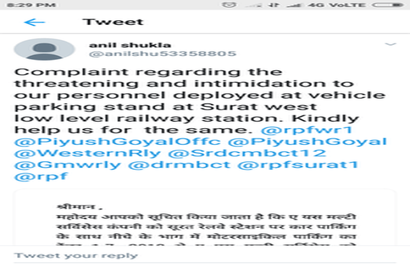 सूरत स्टेशन परिसर में मुख्य द्वार से प्रवेश करते ही बाएं कार पार्किंग और मोटर साइकिल पार्किंग का एरिया है। इस क्षेत्र में पहले चांद खान, तुफैल खान पप्पू और शान खान पार्किंग चला रहे थे, लेकिन एक जुलाई से ठेका बदल गया। मुम्बई रेल मंडल कार्यालय ने ए यस मल्टी सर्विसेज कंपनी को ठेका दिया है। कंपनी ने सूरत स्टेशन पार्किंग के मैनेजर के तौर पर कर्मा नाथू गौड़ को नियुक्त किया। कर्मा जब पार्किंग क्षेत्र में कार्य संभालने गया तो चांद तथा उसके साथियों ने उसका विरोध किया। उसे कार्य का जिम्मा नहीं सौपा गया। आरोप है कि यह लोग एक जुलाई के बाद से बिना किसी अधिकार पत्र यात्रियों से पार्किंग शुल्क वसूल रहे हैं। इस मामले में स्थानीय रेल अधिकारियों से सहयोग नहीं मिलने पर ठेकेदार अनिल शुक्ला ने ट्विटर पर सोमवार रात १०.२८ बजे शिकायत की। उसने रेलमंत्री पियुष गोयल, पश्चिम रेलवे, सीनियर डीसीएम मुम्बई, महाप्रबंधक पश्चिम रेलवे, मुम्बई मंडल प्रबंधक, रेलवे सुरक्षा बल सूरत को टैग कर शिकायत पत्र जारी किया। इसके बाद पश्चिम रेलवे के रेलवे सुरक्षा बल ने वड़ोदरा रेलवे पुलिस तथा मुम्बई रेलवे सुरक्षा बल के अधिकारियों को मामले की जांच के निर्देश दिए। मुम्बई रेलवे सुरक्षा बल के सीनियर डीएससी अनूप शुक्ला के ट्विटर हैंडल से यह जांचने के लिए कहा गया कि मुम्बई एसीएम को टेंडर किसके नाम जारी हुआ। एसीएम मुम्बई ने जवाब में मामला दर्ज कर जांच की बात कही। मुम्बई रेल मंडल प्रबंधक संजय मिश्रा ने इस मामले में सूरत रेलवे सुरक्षा बल को जांच कर रिपोर्ट देने को कहा है। दूसरी तरफ पता चला है कि सूरत स्टेशन के अधिकारियों को इस मामले की कोई जानकारी नहीं थी। पुराने मैनेजर चांद खान ने बताया कि कंपनी के मैनेजर अल्पेश मोदी ने उससे अब तक किराया वसूला है। उसने हमें ही कार्य सौंपा है। इसमें गलतफहमी हुई है। ठेकेदार से बातचीत की जा रही है। ट्विटर हैंडल पर वार्तालाप के बाद रेल अधिकारियों की नींद उड़ गई है। अलग-अलग एजेंसियां इस मामले की जांच कर रिपोर्ट देने में जुटी हैं।