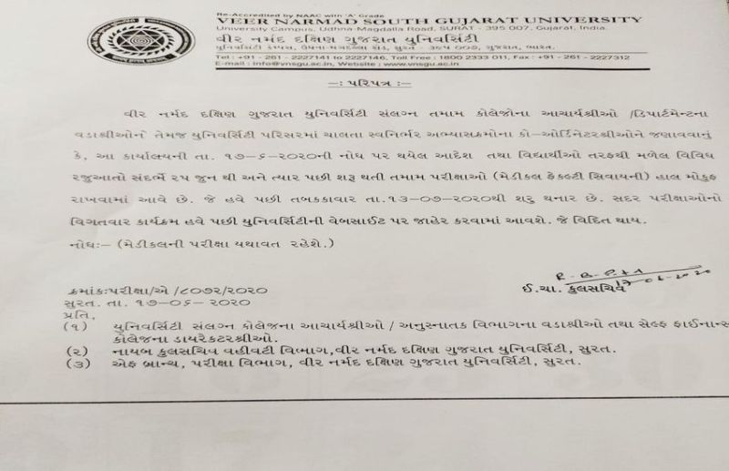 इसके बाद आखिर विश्वविद्यालय प्रशासन ने परीक्षा स्थगित करने का निर्णय लेते हुए परिपत्र जारी कर दिया। परिपत्र अनुसार मेडिकल फैकल्टी के अलावा 25 जून से शुरू होने वाली सभी परीक्षाएं अब 13 जुलाई से शुरू होगी। परिपत्र जारी करने के बाद एनएसयूआई ने धरना समाप्त कर दिया। गौरतलब है कि किरोना का संक्रमण लगातार बढ़ते जा रहा है और सरकार ने 15 अगस्त तक देशभर में शिक्षा कार्य पर रोक लगा दी है। इसके बावजूद वीर नर्मद दक्षिण गुजरात विश्वविद्यालय की ओर से 25 जून से परीक्षा की घोषणा की थी, जिसे लेकर शुरू से ही विरोध हो रहा था। सिंडिकेट सदस्यों ने भी परीक्षा रद्द करने की मांग की थी।