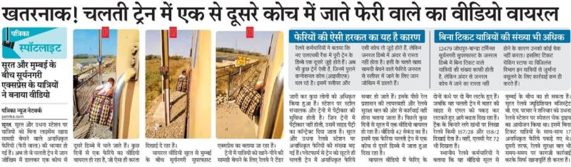 सूरत रेलवे स्टेशन पर मेल-एक्सप्रेस पैसेंजर ट्रेनों के आते ही झूंड में अनाधिकृत फेरिए ट्रेन में सवार हो जाते है। प्लेटफार्म से ट्रेन छूटते ही फेरिए अलग-अलग कोचों में सवार हो जाते है। राजस्थान पत्रिका ने पूर्व में अनाधिकृत फेरियों के झूंड का फोटो के साथ खबर प्रकाशित की है। इसी तरह की स्थिति उधना, नवसारी, वलसाड, वापी समेत अलग-अलग स्टेशनों पर दिखाई देती है। लेकिन ट्रेन में घुमने वाले अनाधिकृत फेरियों के खिलाफ कोई कार्रवाई नहीं होती है। इस बार भी रेलवे ने वीडियो वायरल होने तथा राजस्थान पत्रिका में खबर छपने के बाद एक फेरियो को गिरफ्तार किया है। लेकिन ट्रेन में घूमने वाले अन्य अनाधिकृत फेरियों पर कब कार्रवाई होगी इस पर रेलवे ने चुप्पी साध रखी है।