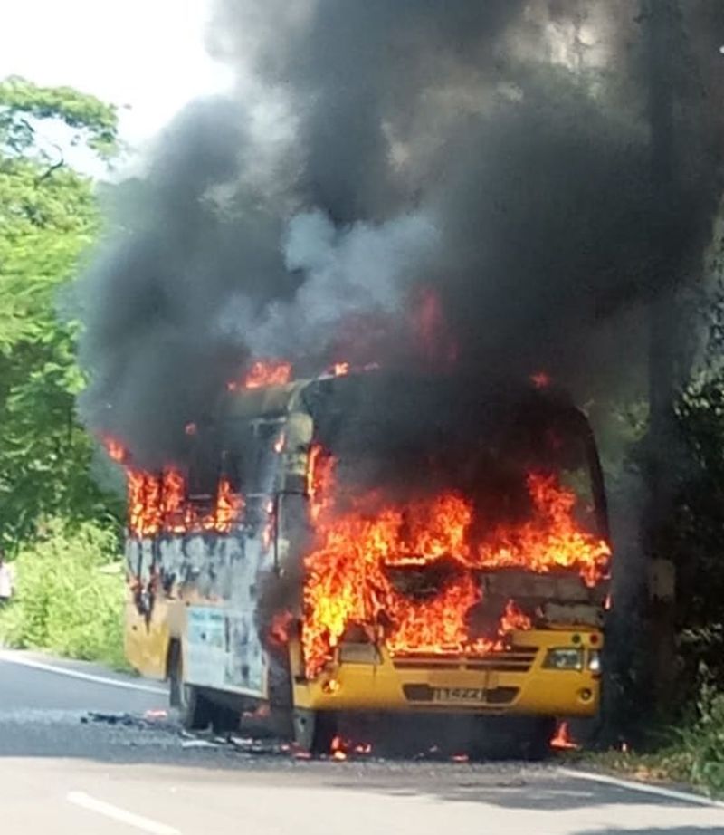 बुधवार को लक्ष्मी विद्यापीठ स्कूल के 20 विद्यार्थियों को लेकर चार शिक्षक धरमपुर साइंस सेन्टर गए थे। वहां से दोपहर को सरीगाम लौटते समय बोदलाई गंव के पास चालक मुस्तकीन ने गियर बॉक्स से धुआं उठता देख तुरंत बस को सडक़ किनारे रोक दिया और सभी विद्यार्थियों और शिक्षकों को बस से नीचे उतार दिया। उसके बाद बस में पड़ी बोतल का पानी गियर बॉक्स पर डालकर आग बुझाने की कोशिश की। देखते ही देखते ही आग ने पूरी बस को चपेट में लिया। सूचना पाकर धरमपुर से जब तक दमकल की गाड़ी वहां पहुंचकर आग पर काबू पाती, बस जलकर खाक हो चुकी थी। बताया गया है कि चालक ने सतर्कता बरतते हुए बस से सभी लोगों को नीचे उतार दिया, जिससे बड़ी घटना होने से बच गई। बस चालक मुस्तकीन ने बताया कि बस के गरम होने से गियर बॉक्स से धुआं निकलने लगा। बोदलाई के आसपास के लोग भी आग बुझाने के लिए पानी लेकर दौड़े थे, लेकिन आग बुझाने में नाकाम रहे। बाद में दूसरी बस मंगवाकर विद्यार्थियों समेत सभी को रवाना किया गया।