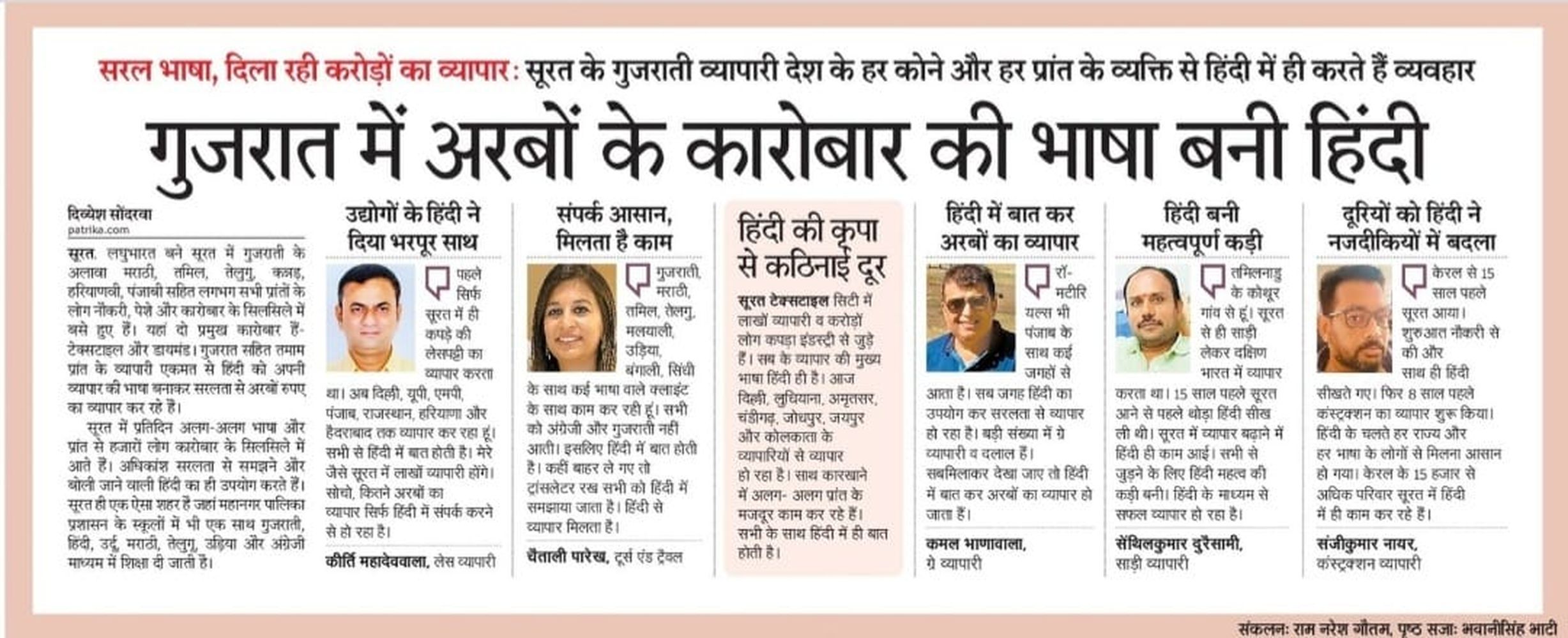 केरल से 15 साल पहले सूरत आया। संस्कृति और भाषा के चलते गुजरात में दिक्कत तो हुई। शुरुआत नौकरी से की साथ हिंदी सीखते गए। फिर 8 साल पहले कंस्ट्रक्शन का व्यापार शुरू किया। हर राज्य और हर भाषा के लोगो से मिलना होता है। लेकिन हिंदी के चलते आसानी से बात हो जाती है। एक राज्य से दूसरे राज्य की सारी दूरियां हिंदी नजदीकियों में बदलदेती है। आज हिंदी के चकते केरल के 15 हजार से अधिक परिवार सूरत में बसकर काम कर रहे है।