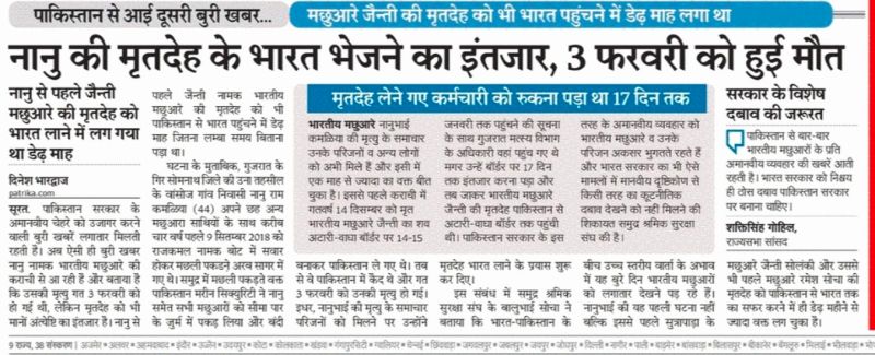 सूरत. आखिर वो संदेश पड़ोसी मुल्क पाकिस्तान से आ ही गया जिसका दो माह से मछुआरे नानु के परिजन इंतजार कर रहे थे। 3 फरवरी को पाकिस्तान स्थित कराची में मृत भारतीय मछुआरे नानु राम कमळिया की मृतदेह पांच अप्रेल तक वाघा-अटारी बॉर्डर पहुंचेगी और यह संदेश मिलने के बाद गुजरात मत्स्य विभाग हरकत में आ गया है। मानवीय दृष्टिकोण के इस मामले में राजस्थान पत्रिका ने सिलसिलेवार खबरें प्रकाशित की हैं।