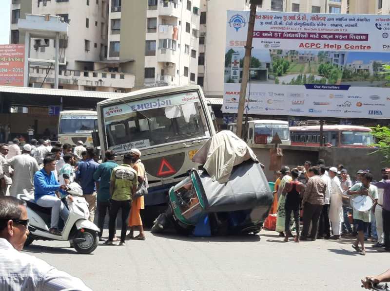 नवसारी. नवसारी एसटी डिपो में खड़ी एक बस अचानक चलने लगी और डिपो के प्रवेश द्वार पर खड़े ऑटो रिक्शा से टकरा गई। इस हादसे में वहां फल बेच रही एक बुजुर्ग महिला की जान बाल-बाल बची।