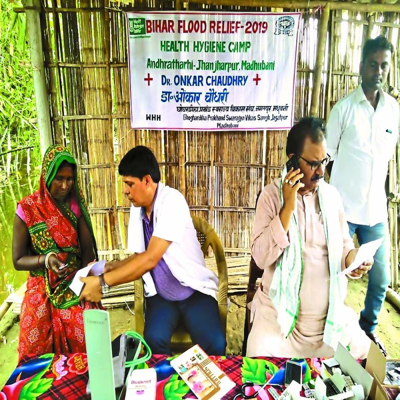 डॉ. ओमकार चौधरी राहत सामग्री लेकर 27 जुलाई को सूरत-भागलपुर एक्सप्रेस से बिहार गए थे। पटना पहुंचने के बाद निजी ट्रांसपोर्ट से राहत सामग्री को मधुबनी ले जाया गया। चौधरी ने घोघरडीहा प्रखंड स्वराज विकास संघ, जगतपुर द्वारा मेडिकल कैम्प लगाने में मदद की। स्वराज विकास संघ के अध्यक्ष रमेश कुमार सिंह ने बताया कि बाढ़ का पानी उतरने के बाद गांव में गंदगी व्याप्त है। पीने का पानी आसानी से नहीं मिल रहा है। बाढ़ के बाद बिगड़े हैंडपंपों को सुधारने तथा क्लोरीन मिलाकर पानी पीने की सलाह दी जा रही है।