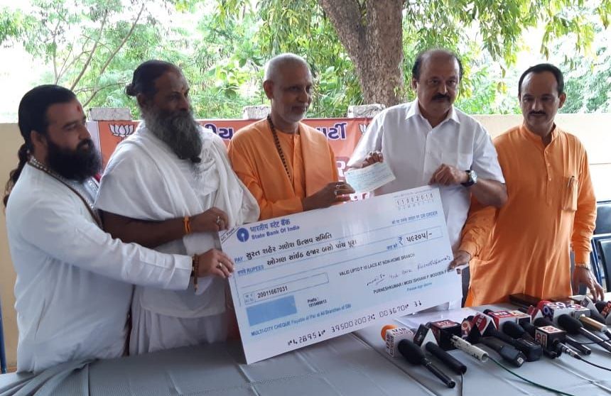 सूरत. सूरत पश्चिम विधायक पूर्णेश मोदी ने अगस्त से अपना पूरा वेतन गणेश उत्सव समिति को देने का ऐलान किया। वेतन के 59205 रुपए का चेक उन्होंने भारत सेवाश्रम संघ के अंबरीशानंद को सौंपा। इस मौके पर गणपति महोत्सव के लिए समिति की तैयारियों की जानकारी भी दी।