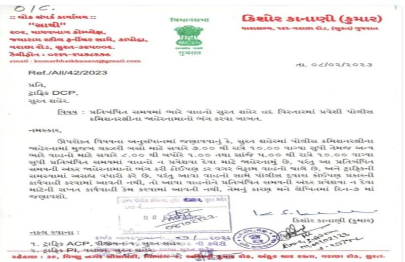 सूरत. पूर्व मंत्री और वराछा के विधायक कुमार कानाणी फिर एक बार प्रशासन के खिलाफ सवाल उठाने वाले पत्र के कारण सुर्खियों में आए हैं। इस बार उन्होंने शहर ट्रैफिक पुलिस विभाग पर सवाल खड़े करते हुए डिप्टी पुलिस आयुक्त को पत्र लिखा है। पत्र में उन्होंने बड़े वाहनों के शहर में प्रवेश को लेकर जारी अधिसूचना का सख्ती से पालन करवाने की मांग की है।
