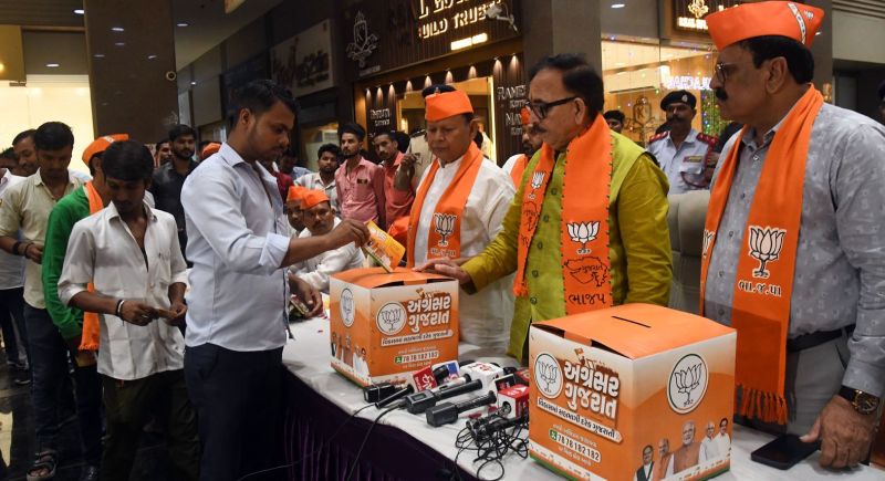 15वें गुजरात विधानसभा चुनाव के लिए भाजपा ने अग्रसर गुजरात संकल्प पत्र तैयार करने के लिए प्रदेश की जनता से सुझाव मांगे हैं और इसके लिए सूरत महानगर में बुधवार से केंद्रीय कौशल विकास मंत्री महेंद्रनाथ पांडेय की मौजूदगी में शुरुआत की गई। इस अवसर पर दोपहर में केंद्रीय मंत्री पांडेय सहारा दरवाजा के निकट ग्लोबल टेक्सटाइल मार्केट पहुंचे और वहां लोगों ने उनकी मौजूदगी में सुझाव बॉक्स में भाजपा के संकल्प पत्र के लिए अपने-अपने सुझाव पोस्टकार्ड पर लिखकर डाले। सुझाव पत्र देने वालों में ज्यादातर व्यापारी, पार्सल ठेकेदार, श्रमिक व अन्य लोग थे। इस दौरान केंद्रीय मंत्री महेंद्रनाथ पांडेय ने भाजपा की केंद्र व राज्य सरकार को डबल इंजन सरकार बताते हुए उसकी कई उपलब्धियों को वहां गिनवाया। इसके बाद यहां से भाजपा नेता व कार्यकर्ता रिंगरोड कपड़ा बाजार स्थित श्रीसालासर प्रवेशद्वार पहुंचे और वहां भी व्यापारियों समेत अन्य लोगों ने संकल्प पत्र के लिए पोस्टकार्ड में सुझाव लिखकर बॉक्स में डाले। रिंगरोड कपड़ा बाजार में सुझाव देने वालों में ज्यादातर लोग उत्तर भारत के प्रवासी थे और अधिकांश ने ट्रेन यातायात में सहूलियत बढ़ाने का सुझाव भाजपा को दिया।