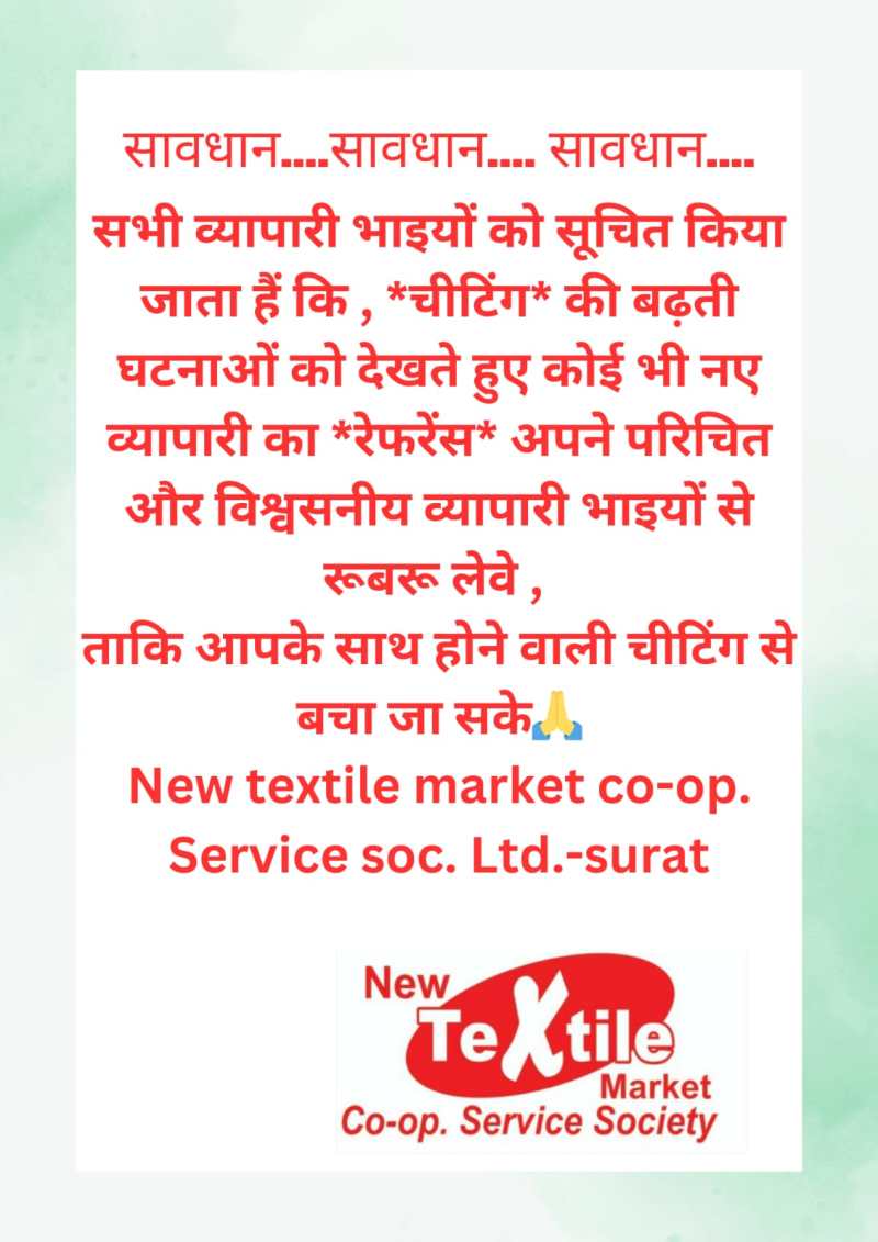 कपड़ा बाजार में रेफरेंस के नाम पर तरह-तरह से स्थानीय कपड़ा व्यापारियों के साथ हो रही चीटिंग की घटनाओं को ध्यान में रख टेक्सटाइल मार्केट्स सोसायटी व एसोसिएशन ने भी जागरुकता मुहिम शुरू की है। मार्केट सोसायटी ने कपड़ा व्यापारियों को सतर्कता के साथ व्यापार करने की हिदायत देते हुए सोशल मीडिया पर पोस्टर जारी कर बताया है कि चीटिंग की बढ़ती घटनाओं को ध्यान में रख कोई भी नए व्यापारी का हवाला अपने परिचित व विश्वसनीय व्यापारियों से प्रत्यक्ष में लेवें ताकि चीटिंग की घटना से बचा जा सके।