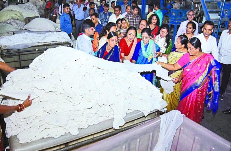 सुबह विजया चक्रवर्ती के साथ सूरत की सांसद दर्शना जरदोष और आठ अन्य महिला सांसदों ने लक्ष्मीपति मिल का दौरा किया। उन्होंने वहां अलग-अलग विभाग में काम करने वाली महिलाओं से पूछा कि उनका वेतन कितना है, समय पर दिया जाता है या नहीं, स्वास्थ्य और सुरक्षा के लिए क्या इंतजाम हैं? महिला सांसदों की टीम ने बाद में घरों पर साड़ी वगैरह का जॉब वर्क करने वाली कुछ महिलाओं से बात कर उनके हालात जाने। लक्ष्मीपति ग्रुप के एम.डी संजय सरावगी के साथ टीम ने इस पर चर्चा की गई कि जीएसटी के बाद महिलाओं के रोजगार पर क्या असर पड़ा है।