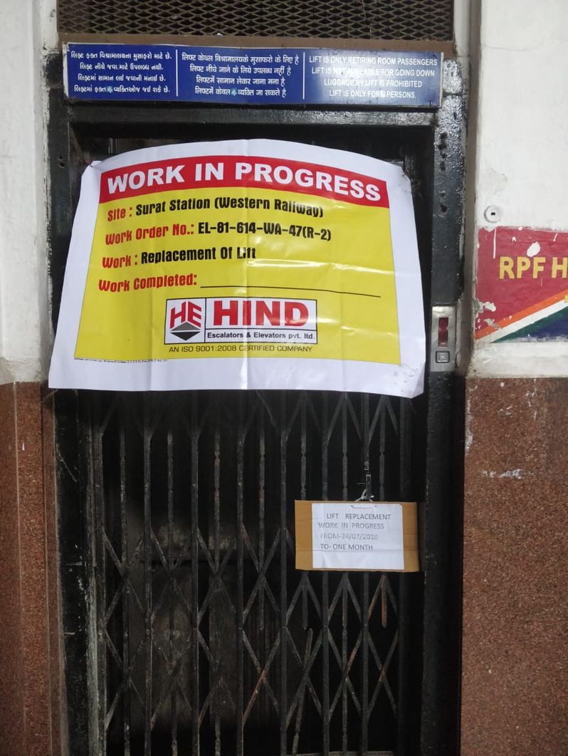 सूरत स्टेशन बिल्डिंग में ग्राउंड फ्लोर से तीसरी मंजिल तक जाने वाली लिफ्ट को रिनोवेशन के लिए 24 जुलाई को बंद किया गया था। इसका कार्य पूरा करने की अंतिम तारिख ३१ अगस्त तय की गई थी, लेकिन कंपनी तय समय पर कार्य पूरा नहीं कर सकी। रेलवे ने मियाद एक महीना और बढ़ाते हुए ३० सितम्बर कर दी थी, लेकिन, एक अक्टूबर को भी लिफ्ट चालू नहीं हो सकी।