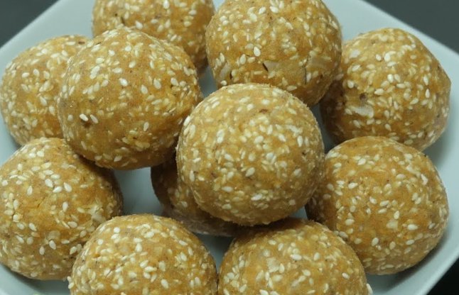 इसके बाद, कढ़ाही में तिल डालकर इसे फूलने और रंग बदलने तक २ मिनिट लगातार चलाते हुए मध्यम आंच पर भून लीजिए। भुने तिल को आटे में ही मिला दीजिए।