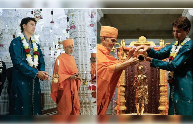 कनाडा के प्रधानमंत्री जस्टिन ट्रूडो ने रविवार को स्वामी नारायण मंदिर के 10वें स्थापना दिवस पर मंदिर में पूजा अर्चना कर जलाभिषेक किया। इनके साथ कनाडा में भारत के राजदूत विकास स्वरूप और टोरंटो के मेयर जॉन टोरी भी मौजूद रहे। जस्टिन ट्रूडो ने इस मौके पर नीले रंग का कुर्ता और सफेद पायजामा पहन रखा था।