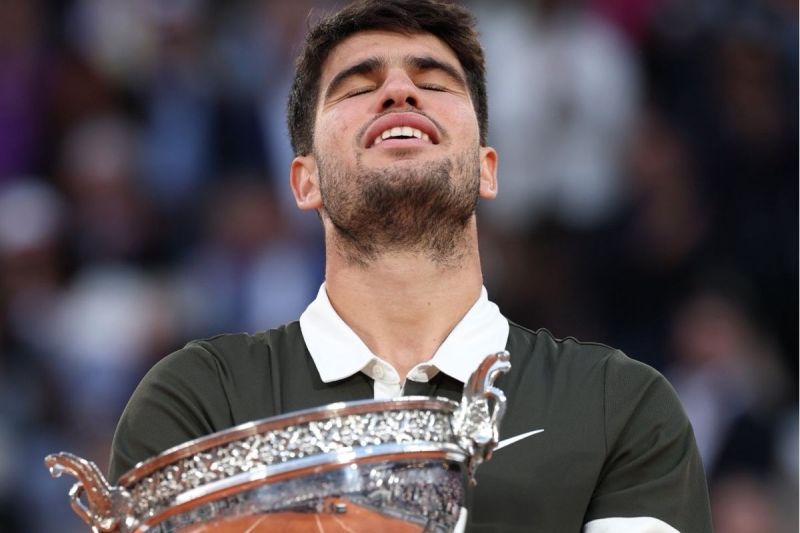 French Open 2025 का खिताब जीतने के बाद प्रसन्न मुद्रा में कार्लोस अल्काराज़। (फोटो सोर्स: /carlosalcaraz)