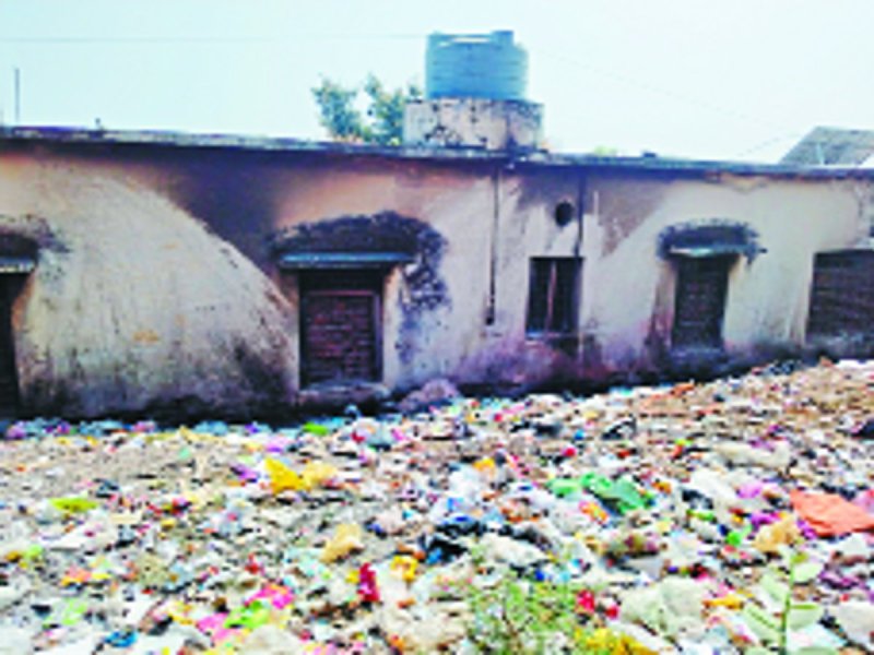 अस्पताल के दरवाजों पर फैली घास और सामने लगे कचरे के ढेर