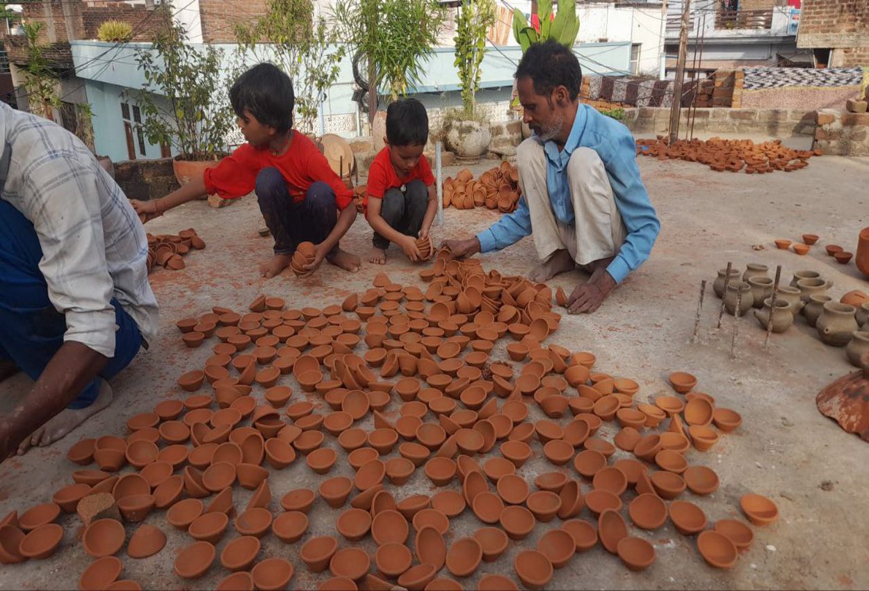 टीकमगढ़। बच्चों के साथ दीपक सहेजते कारीगर।
