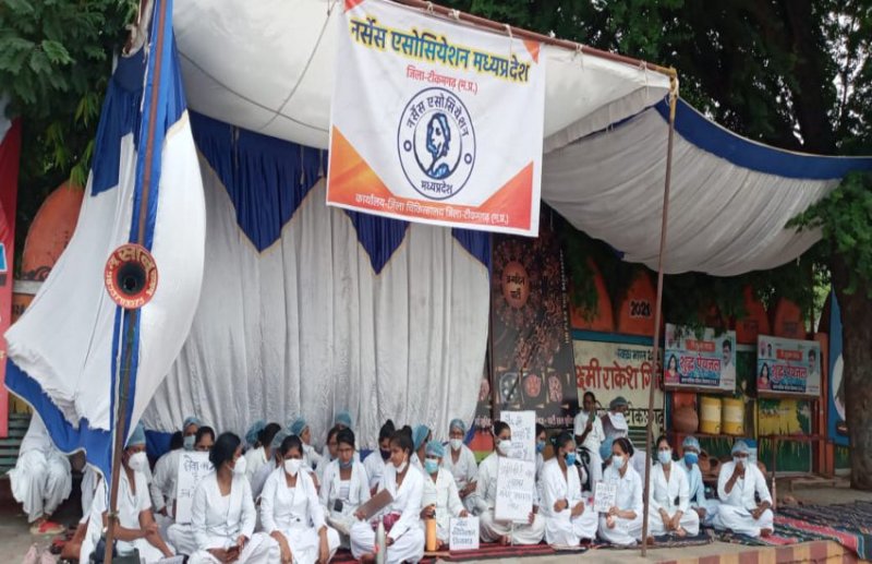 टीकमगढ़. आशा-ऊषा, पटवारियों के बाद अब नर्सों ने हड़ताल शुरू कर दी है। बुधवार को तमाम नर्सों ने अस्पताल चौराहे पर धरना-प्रदर्शन शुरू कर दिया। नर्सों का कहना है कि जब तक शासन उनकी मांगों को नहीं मानता है, तब तक हड़ताल जारी रहेगी। नर्सों ने शासन से 12 मांगों को पूरा करने को कहा है।