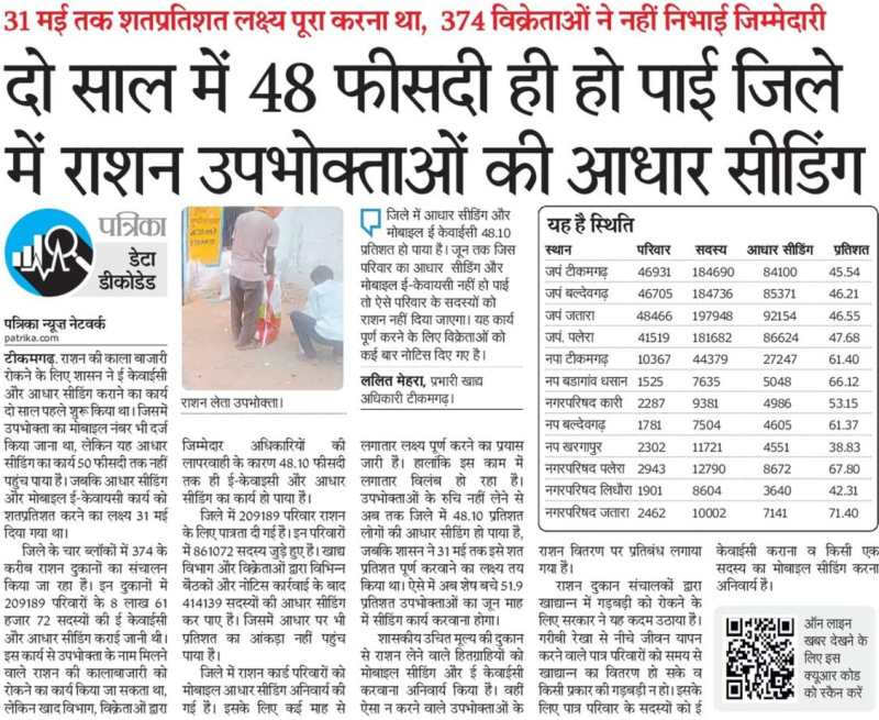 टीकमगढ़, बल्देवगढ़, पलेरा और जतारा में २०९१८९ परिवारों के ८ लाख ६१ हजार ७२ सदस्य दर्ज है। इनकी ई-केवाइसी और मोबाइल सीडिंग कराने का कार्य दो वर्षों से किया जा रहा है। जिसके लिए एसडीएम, कनिष्ठ खाद्य अधिकारियों द्वारा प्रशिक्षण दिया गया। समय-समय पर विक्रेताओं को नोटिस कार्रवाई की गई। उसके बाद भी ई-केवाईसी ४८.३९ और मोबाइल सीडिंग ६२.६७ फीसदी तक हो पाई है। इस कार्य को शतप्रतिशत कराने के लिए एसडीएम, कनिष्ठ खाद्य अधिकारियों और विक्रेताओं को नोटिस दिए गए है। जबकि इस कार्य को कराने के लिए पत्रिका ने ३ जून को खबर का प्रकाशन किया था।