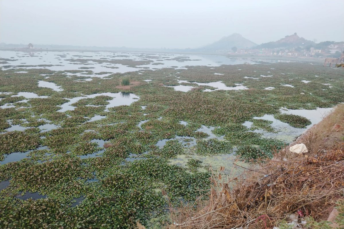 तालाब में फैली जलकुंभी