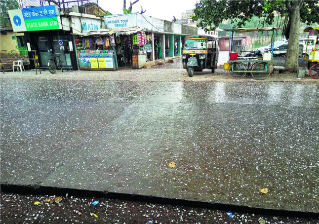 (फोटो कैप्शन:बारिश के साथ हुई ओलावृष्टि से सड़क पर पड़े ओले।)