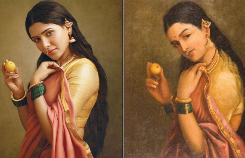 साउथ एक्ट्रेस समांथा अक्केनी पेंटिंग में एक गर्भवती मां के पोज में है जिसके हाथ में नए जीवन के प्रतीक के रूप में एक फल है।