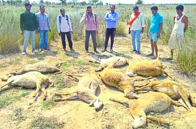 निवाई. ग्राम पंचायत ललवाडी के गांव विजयगोङ्क्षवदपुरा में माल की ढाणी में अलसुबह अचानक एक पशु पालक के बाड़े में विषैला चारा खाने से ग्यारह भेड़ों की मौत हो गई। अपनी आंखों के सामने तड़पती एवं एक-एक कर दम तोड़ती भेड़ों को देखकर पशुपालक जोर-जोर रोता हुआ चिल्लाने लगा। उसकी आवाज सुनकर परिजन एवं आसपास के लोग दौडकऱ आए। ग्रामीणों ने ललवाडी सरपंच देवालाल गुर्जर को भेड़ों के मरने के बारे जानकारी दी।
