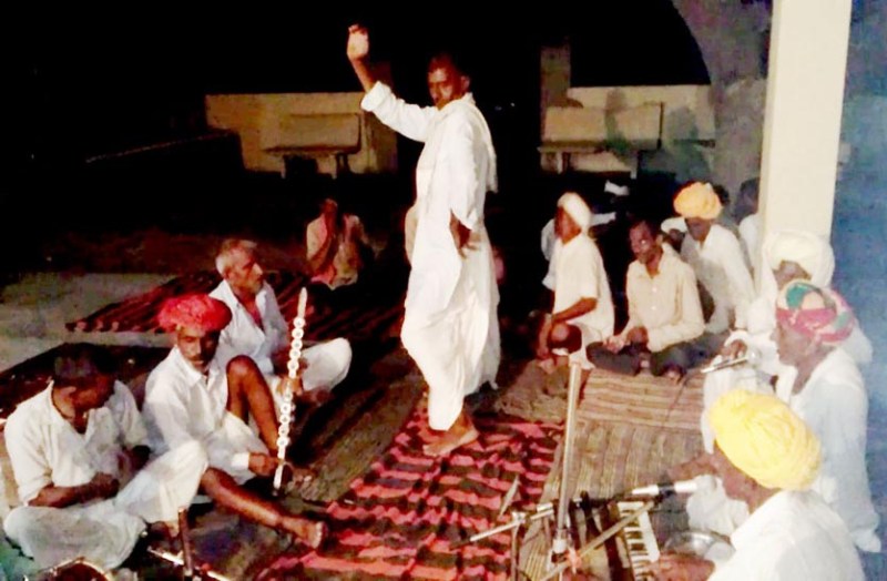 लाम्बाहरिसिंह चामुण्डा माता मंदिर परिसर में गुरुवार रात आयोजित भजन संध्या में भजन प्रस्तुति नृत्य पेश करता कलाकार।