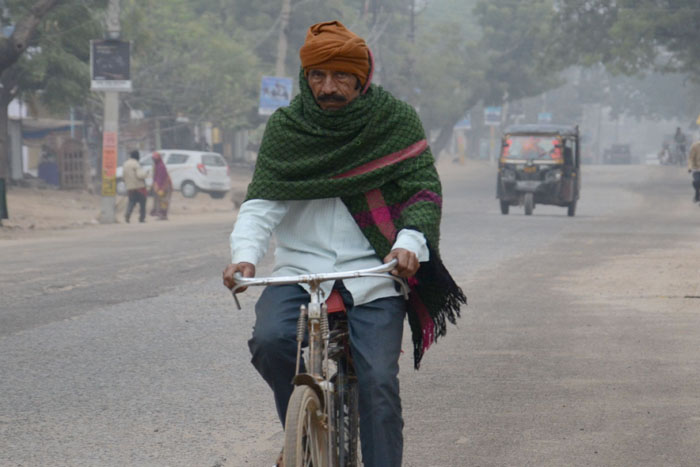 टोंक में कोहरे के बीच कम्बल लपेटे साइकिल सवार।