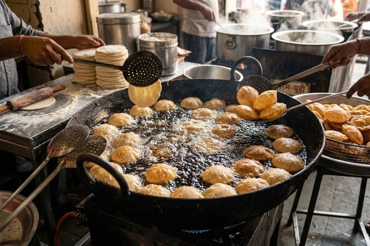 पूड़ी तलने के दौरान की तस्वीर (फोटो-एआई)