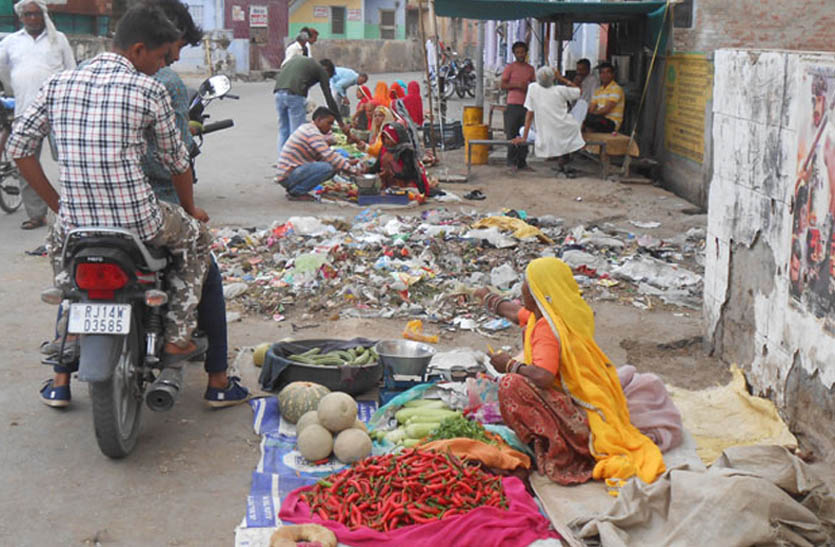 मालपुरा गंदगी के ढेर के पास बैठकर सब्जी बेचती महिलाएं।