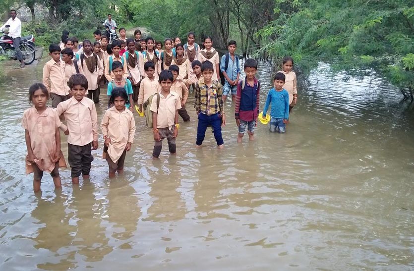 लाम्बाहरिसिंह क्षेत्र के चतरपुरा गांव मेंं यूपीएस विद्यालय के बाहर भरे पानी से गुजरते विद्यार्थी।