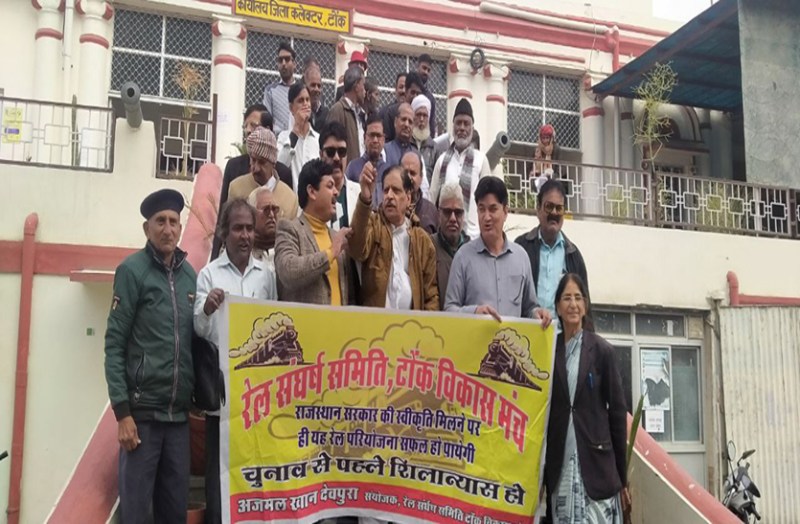 ताकि टोंक में रेल जल्द आ सके। ज्ञापन देने वालों में समिति संयोजक मोहम्मद अजमल, समन्वयक ओमप्रकाश गुप्ता, पेंशनर्स जिलाध्यक्ष बृजबिहारी शर्मा, हनुमानसिंह सोलंकी, मुमताज खान, मतीन मिर्जा, विष्णु गुप्ता, पोखरलाल जाट, आसिम पठान, अमीनेश जैन, रईस अंसारी आदि शामिल थे।