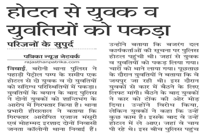 निवाई. बरोनी थाना पुलिस की ओर से होटल से पकड़े गए दो युवकों के मामले में पत्रिका में प्रकाशित खबर के बाद कार्यपालक मजिस्ट्रेट गजेन्द्र गोयल ने संज्ञान लिया है।