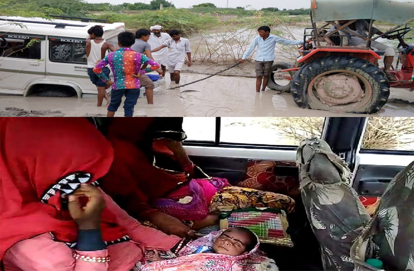 प्रसूताओं को गोद में ले जाकर कराया रास्ता पार, छोडऩे जा रही कार फंसी, 3 घंटे की मशक्कत के बाद कीचड़ से निकली कार