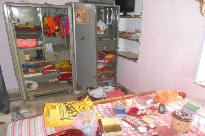 मालपुरा की आदर्श नगर कॉलोनी में चोरी के बाद कमरे में बिखरा सामान।