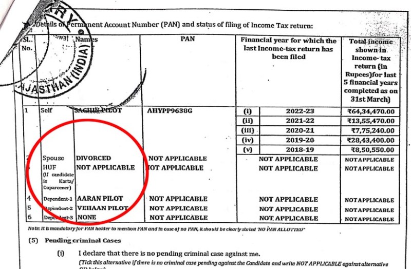 सचिन पायलट के शपथ पत्र में बेटों के नाम: कॉलम में लिखा तलाक