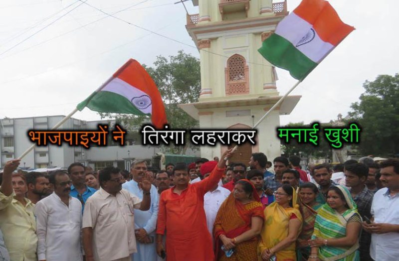 जम्मू-कश्मीर में धारा 370 व 35 ए हटाने पर भाजपाइयों ने घंटाघर चौंक पर तिरंगा लहराकर मनाई खुशी