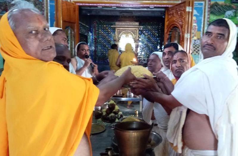 अतिशय क्षेत्र चन्द्रप्रभु दिगम्बर जैन मंदिर मेहन्दवास में निर्वाण लड्डू चढ़ाते श्रद्धालु।