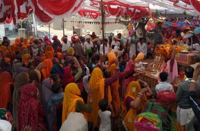 पचेवर के राथल्या गांव मे चल रही श्रीमद्भागवत कथा के अवसर पर नृत्य करती महिलाएं व उपस्थित अन्य लोग।