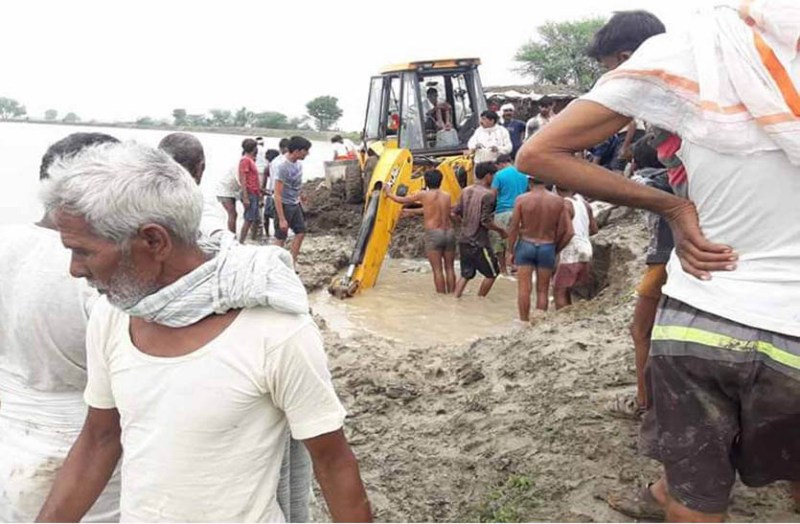 अलीगढ़. हेदरीपुरा पंचायत के बराणा तालाब में बोर पडऩे के बाद जेसीबी से दुरुस्त कराते ग्रामीण।