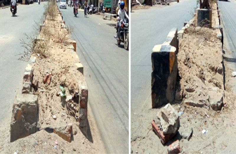 यहां से गुजरने वाले वाहनों की चपेट में आकर कई स्थानों पर डिवाइडर ढह गए है। इसके चलते इनकी ईंटें बाहर निकलकर सडक़ पर फैल रही है। वहीं डिवाइडरों पर लगाए गए 80 फीसदी मेहन्दी के पौधे देखरेख के अभाव मेें सूख गए। स्थिति यह है कि तीन-चार स्थानों को छोडकऱ अन्य सभी जगह केवल सूखी टहनियां खड़ी है।
