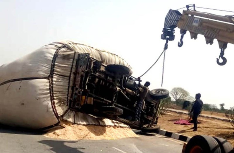 राजमार्ग पर पलटा तूड़ी से भरा ट्रक, बाल-बाल बचे चालक, सवार ओर राहगीर